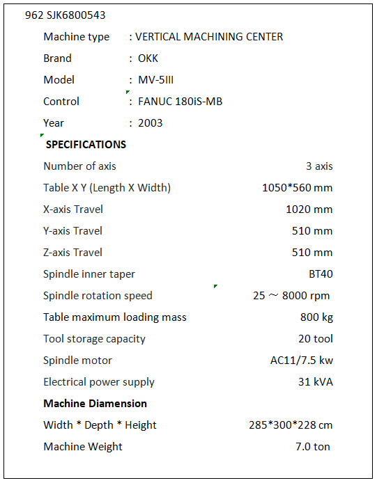 | SJK6800543 | NONE | OKK | VM5-3 | FANUC 180iS-MB | 2003 | stock |